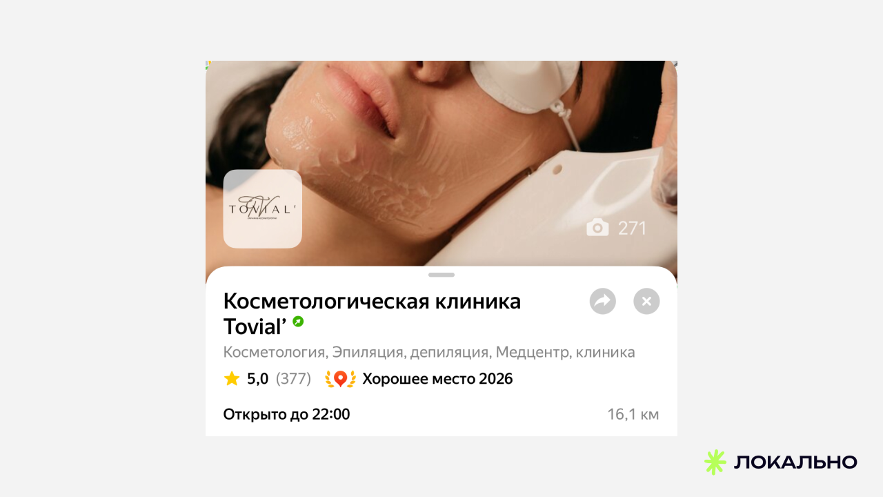 Косметологическая клиника Tovial’ в Санкт-Петербурге обратилась с запросом на улучшение присутствия в Яндекс.Картах. Карточка была оформлена слабо, ответы на отзывы — шаблонные, сервис записи — неудобный. За 3,5 месяца мы полностью переработали карточку, внедрили систему работы с отзывами и промокодами, оспорили 18 негативных отзывов. Рейтинг вырос с 4,7 до 5,0, количество записей увеличилось на 27% по сравнению с аналогичным периодом прошлого года.