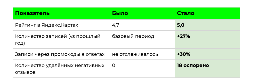 Рост записей на 27% по сравнению с тем же периодом прошлого года — комплексный результат: улучшенная карточка, удобная запись и работающий канал через ответы на отзывы с промокодами.