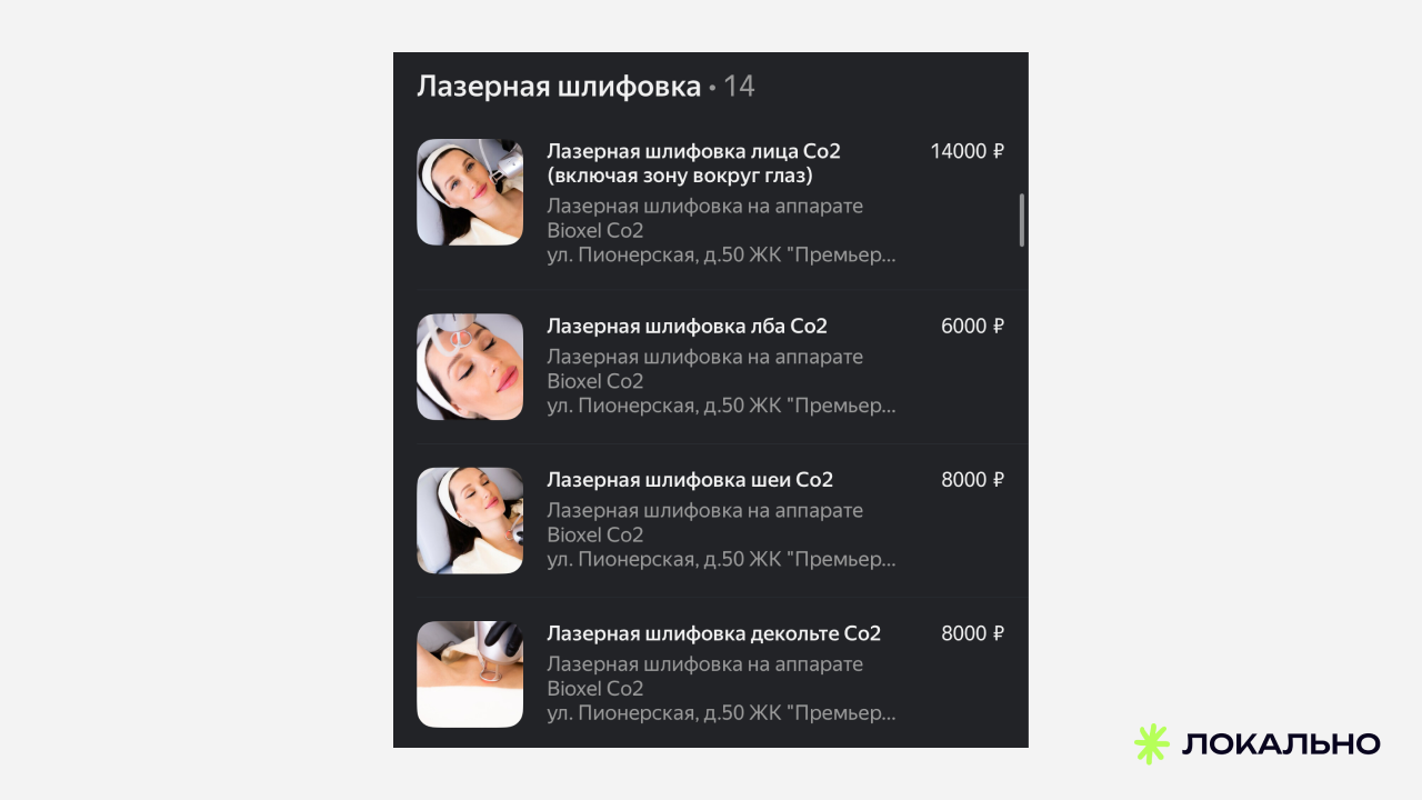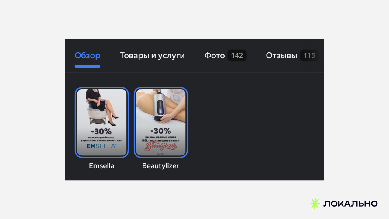 Принципиальная позиция: в медицине каждый элемент карточки должен работать на доверие. Пациент принимает решение о процедуре на лице или теле — ему важно видеть профессиональную обстановку, конкретные препараты и реальные отзывы с ответами клиники.