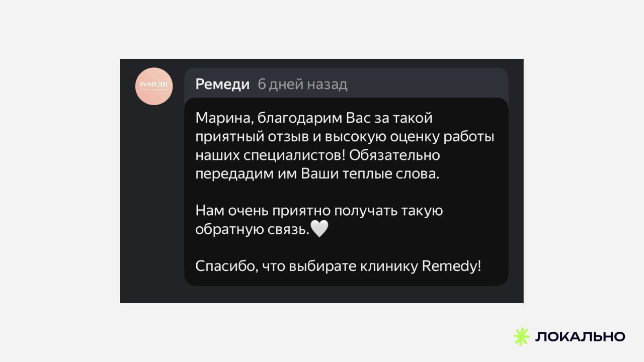 Параллельно мы выстроили системную работу с положительными отзывами: каждый отзыв получал персональный ответ. Это важно по двум причинам: алгоритмы Яндекса учитывают активность в карточке, а потенциальные пациенты читают не только отзывы, но и то, как клиника на них реагирует.